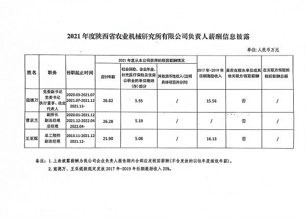 2021年度陜西省農(nóng)業(yè)機械研究所有限公司負責(zé)人薪酬信息披露