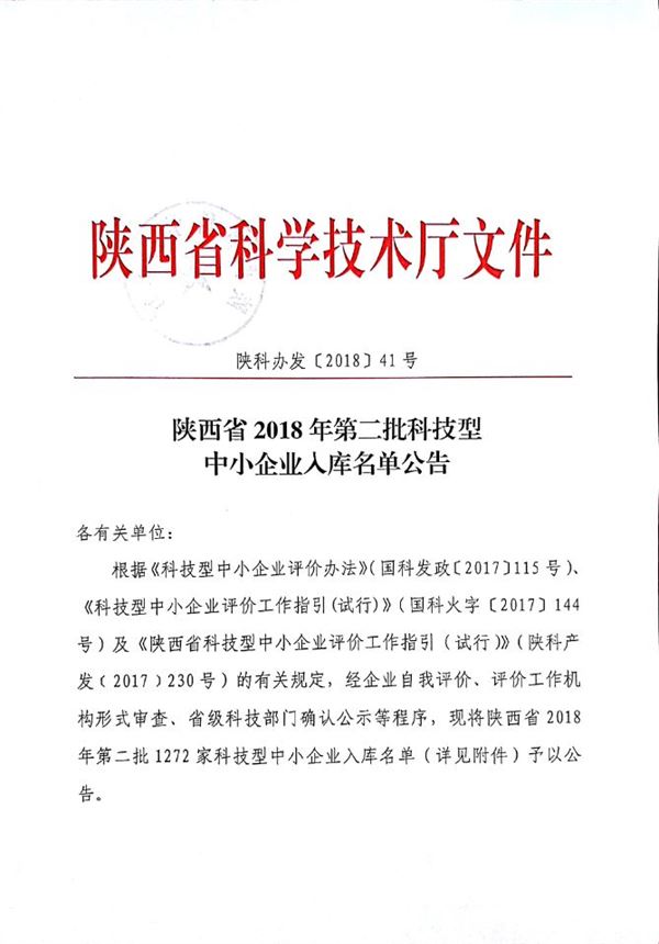 根據(jù)《科技型中小企業(yè)評價辦法》(國科發(fā)政〔2017〕115號)、《科技型中小企業(yè)評價工作指引(試行)》(國科火字〔2017〕144號)及《陜西省科技型中小企業(yè)評價工作指引(試行)》(陜科產發(fā)﹝2017﹞230號)的有關規(guī)定,我所在科技型中小企業(yè)評價系統(tǒng)上進行自我評價、經陜西省科學技術廳審查,被評定為陜西省科技型中小企業(yè),于2018年3月15日在陜西科技信息網上公示。